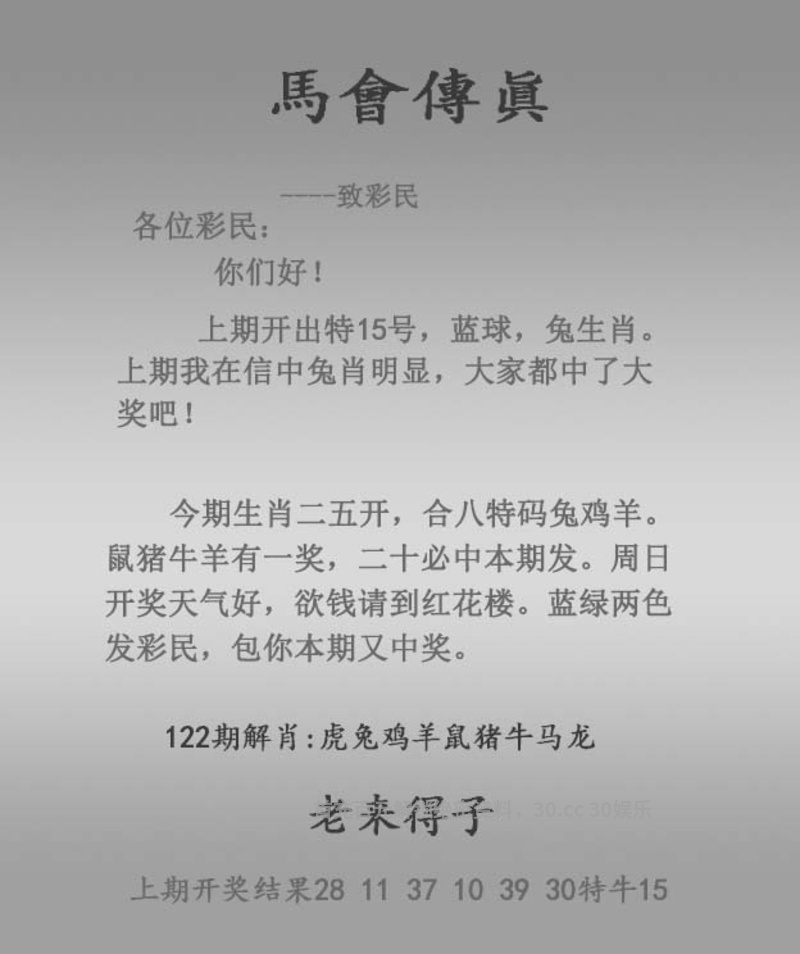 | 123期:平特复式{羊11}{鼠30}{兔15}{牛05} |