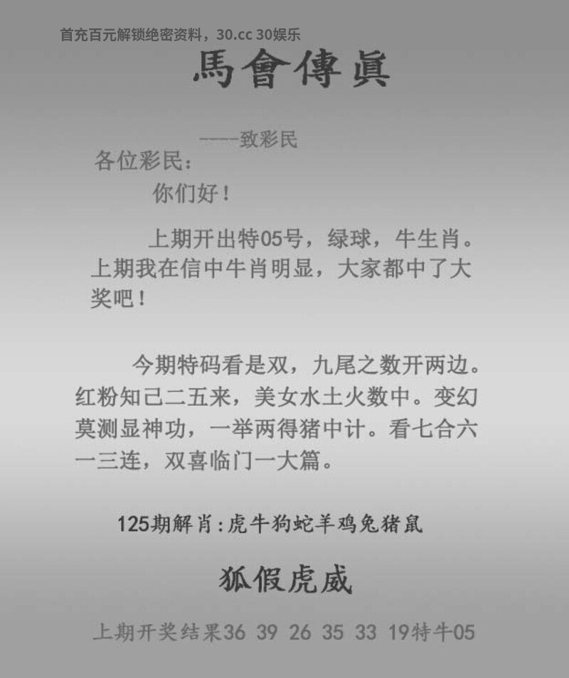 125期马会传真: 今期特码看是双,九尾之数开两边 红粉知己二五来,美女水土火数中 变幻莫测显神功,一举两得猪中计 看七合六一三连,双喜临门一大篇 狐假虎威 解:今期特码看是双,解双肖虎鼠狗猴马龙,一举两得猪中计,解凶丑生肖鼠牛虎猴狗猪 特围生肖:马蛇虎鸡龙羊鼠狗猴 |